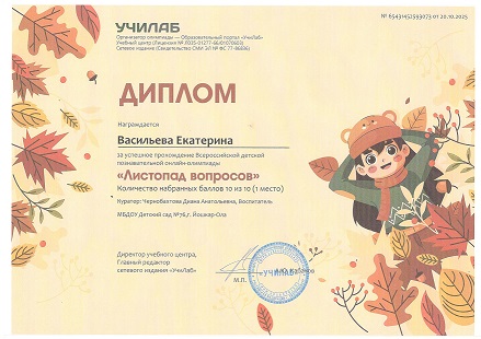 Диплом за 1 место во Всероссийской детской познавательной онлайн-олимпиады "Листопад вопросов", 2025 год |