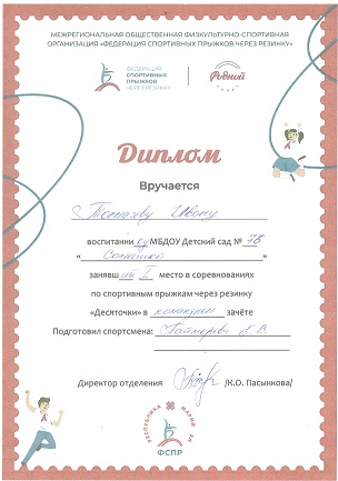 | Диплом за I место в соревнованиях по спортивным прыжкам через резинку, 2025 год |