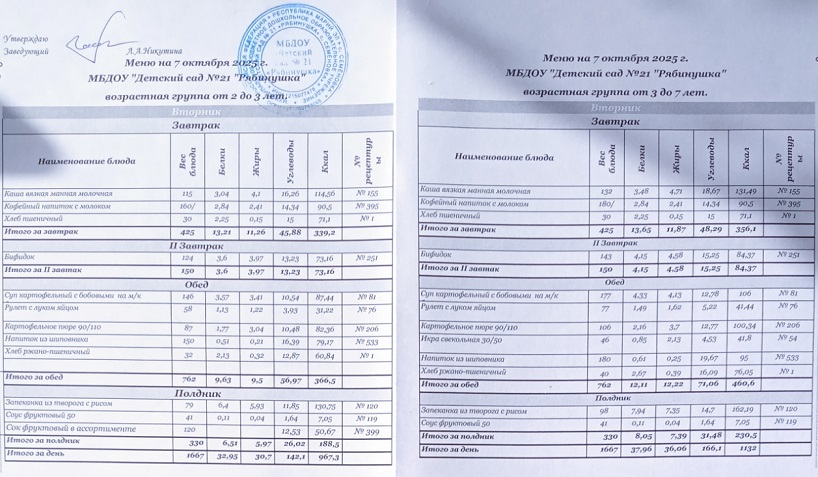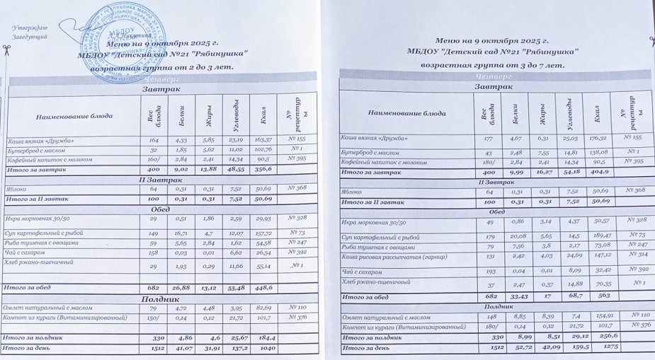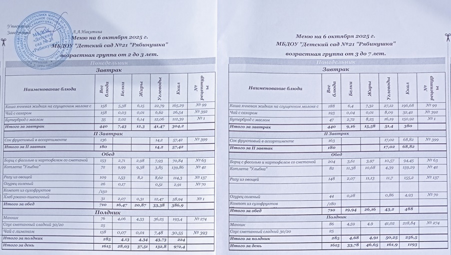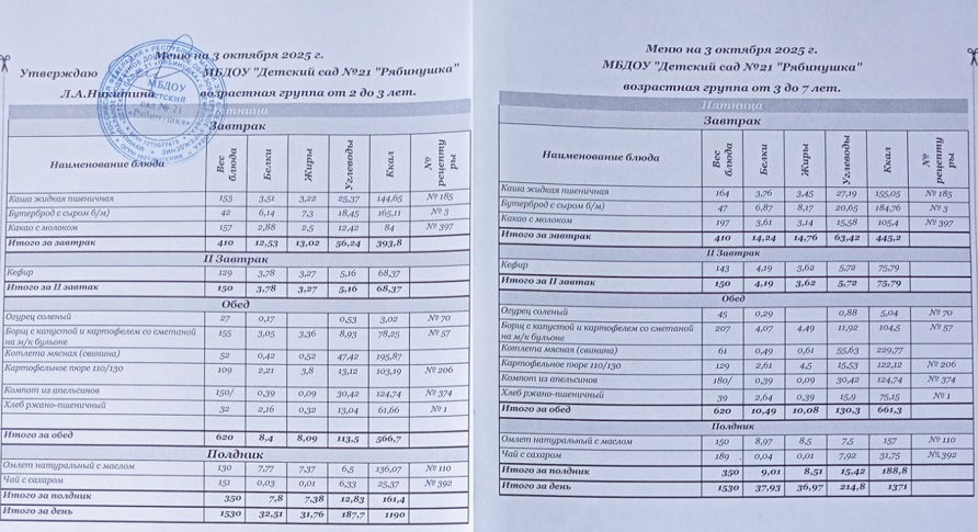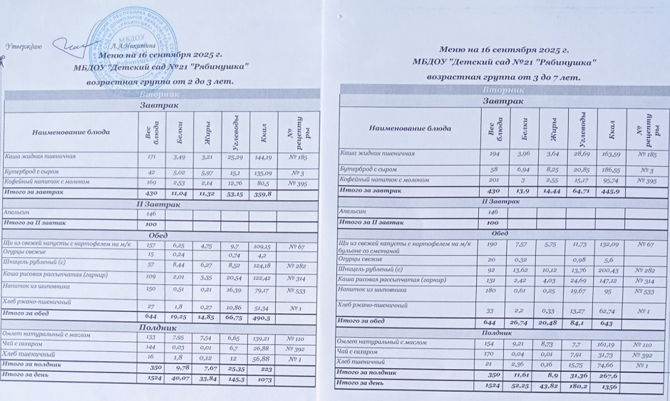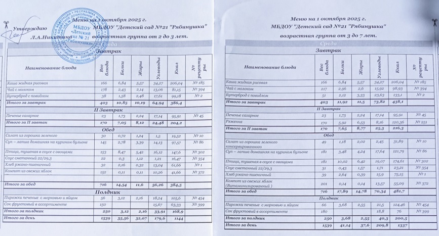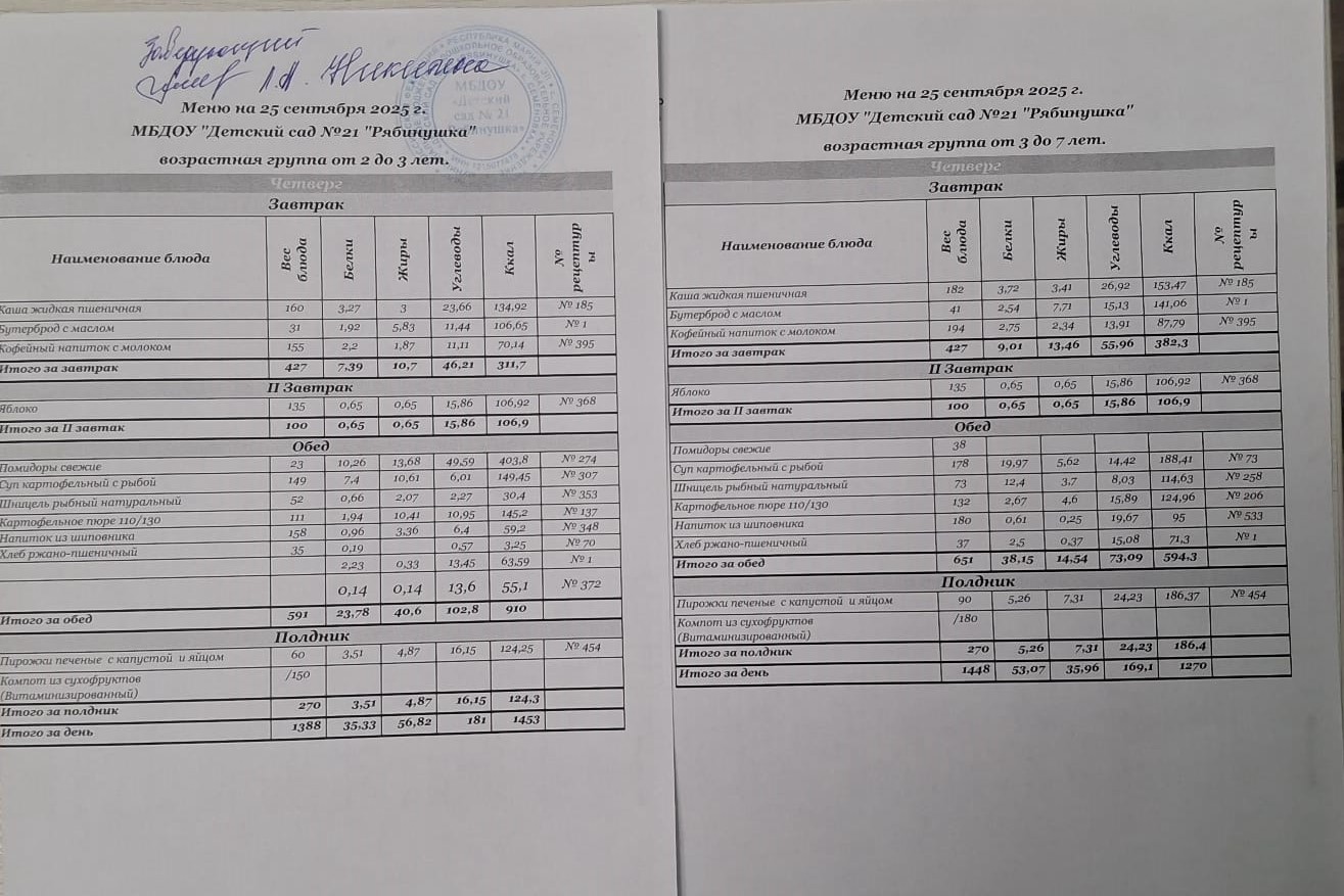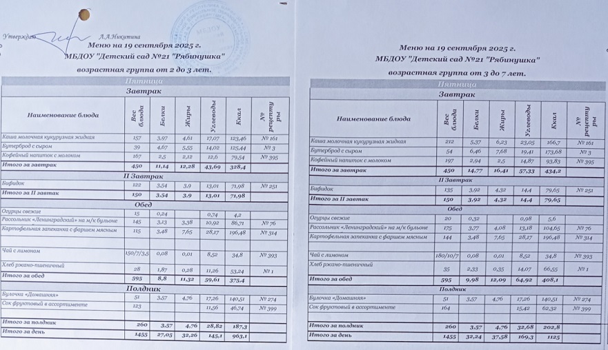 МБДОУ "Детский сад № 21 "Рябинушка" > Меню ежедневное