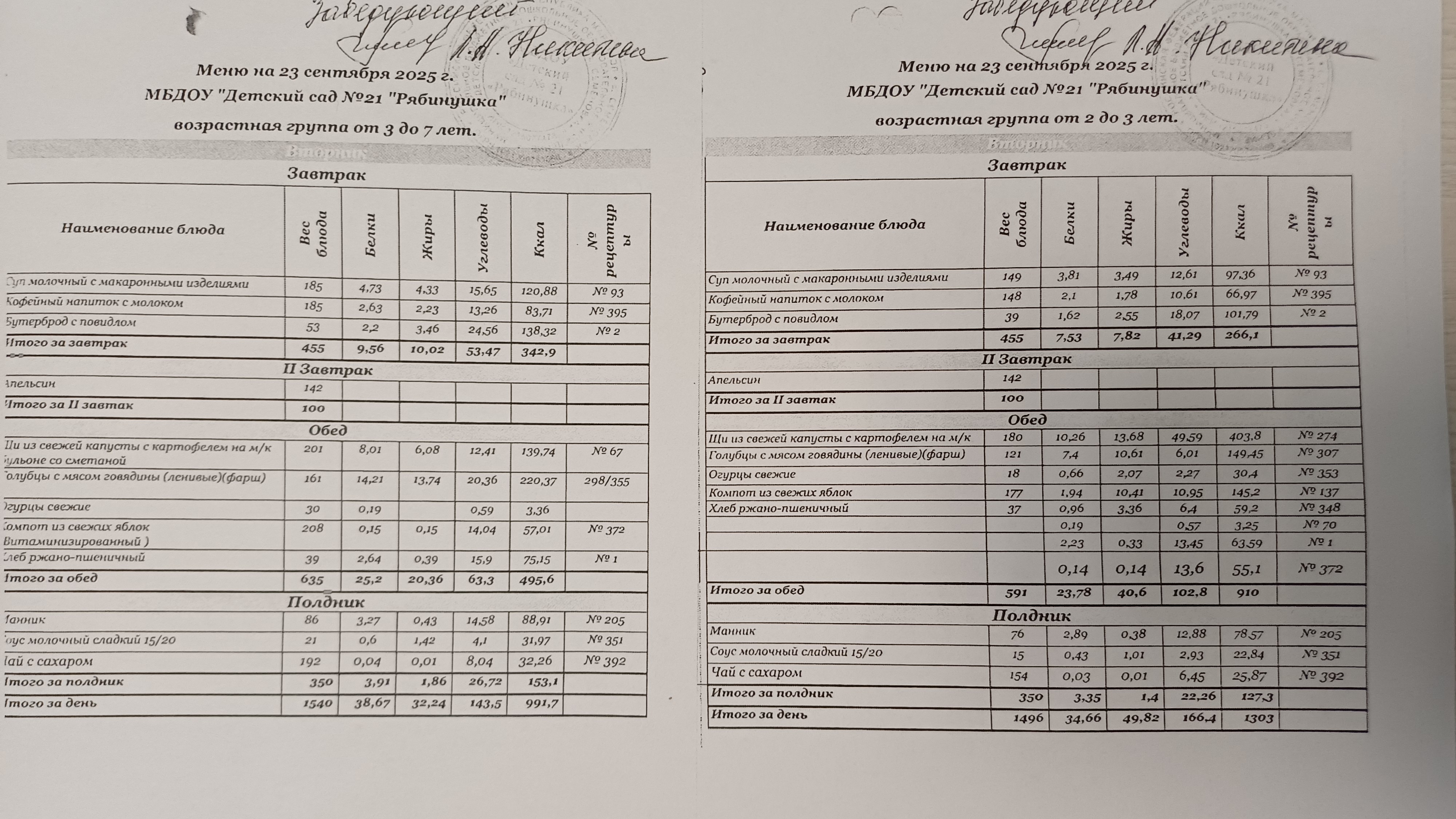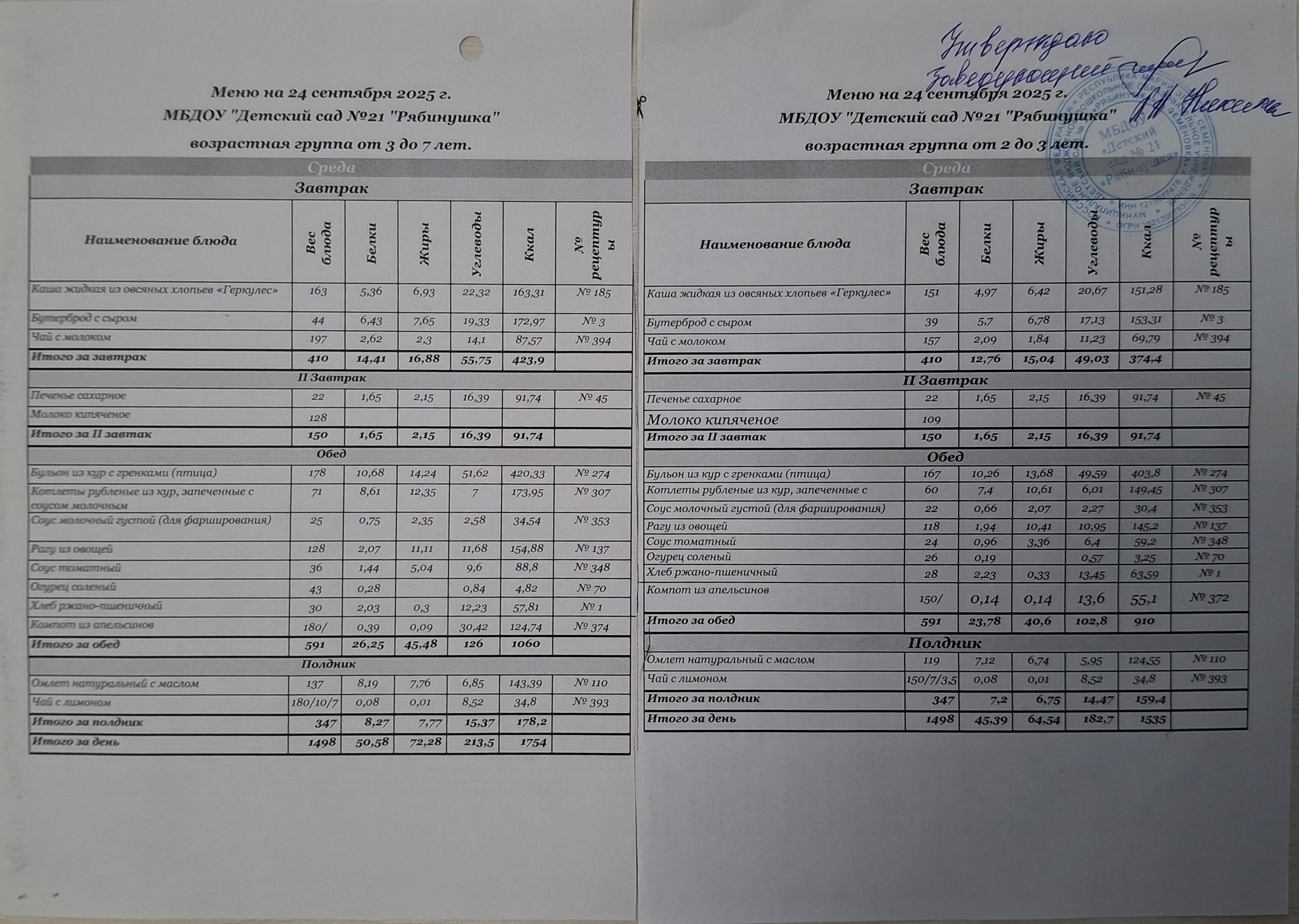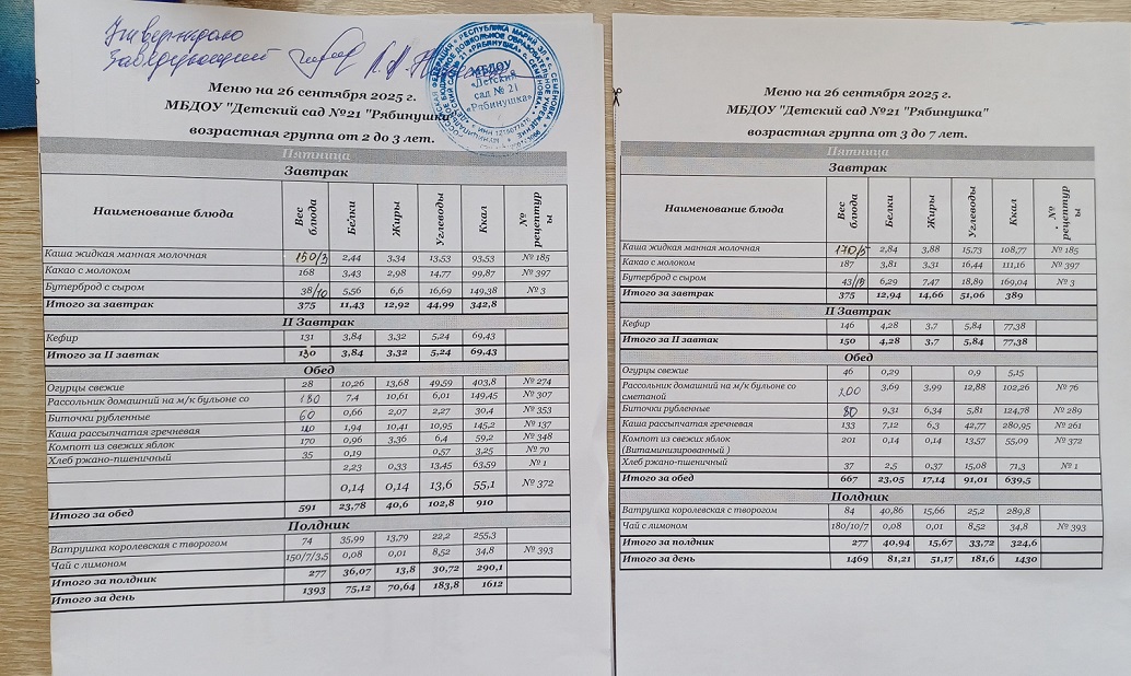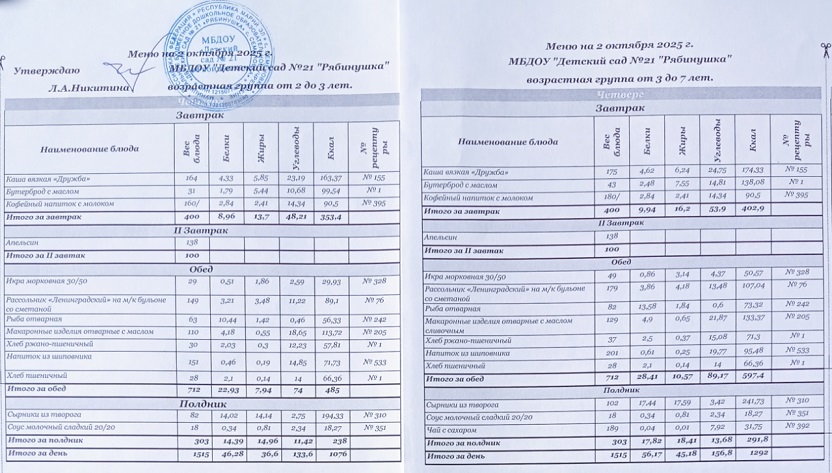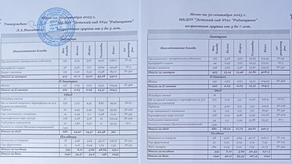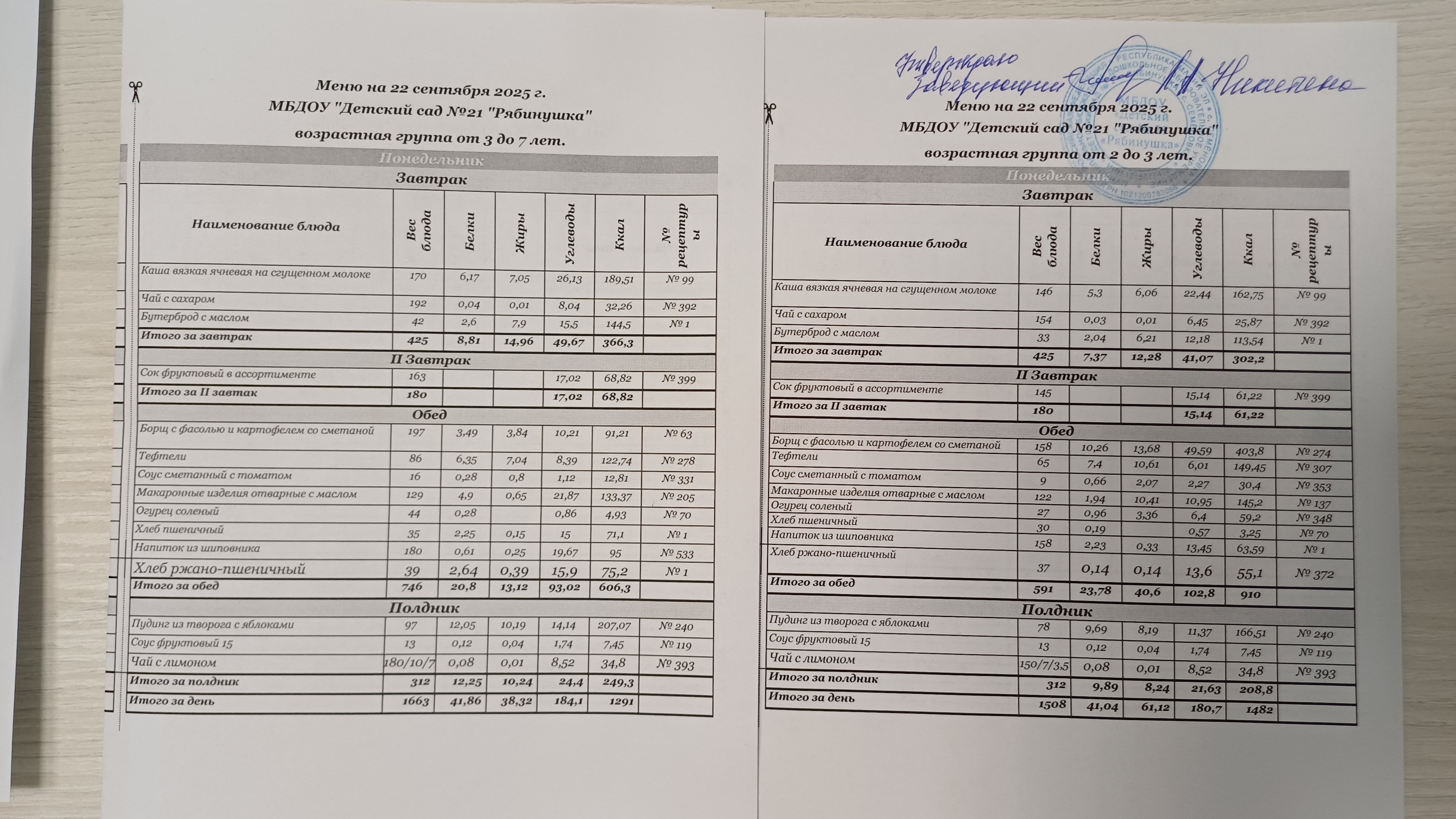 МБДОУ "Детский сад № 21 "Рябинушка" > Меню ежедневное