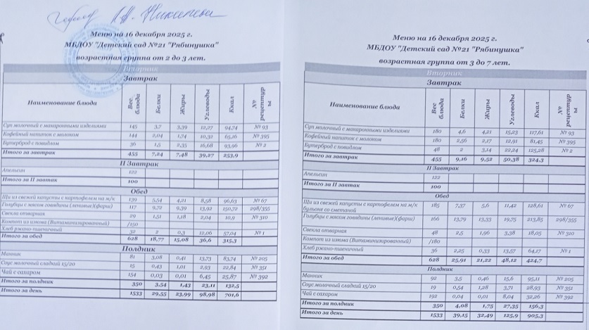 МБДОУ "Детский сад № 21 "Рябинушка" > Меню ежедневное