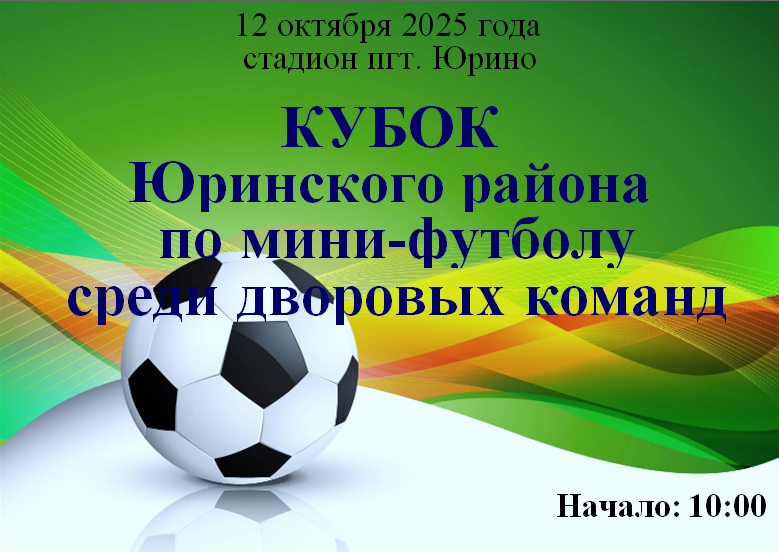12 октября на стадионе пгт.Юрино состоится розыгрыш Кубка Юринского района по мини-футболу. К участию приглашаются спортсмены в возрасте 14 лет и старше. Начало в 10.00. Афиша во вложении.