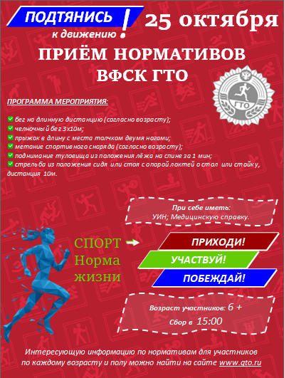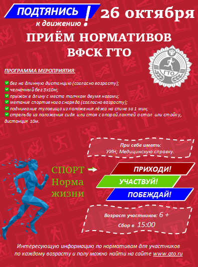 25, 26 октября запланировано проведение мероприятия по сдаче нормативов ГТО. Приглашаем всех желающих в возрасте 6 лет и старше. В программе виды испытаний, которые можно и нужно успеть сдать на открытом воздухе. Приходите обязательно, еще можно успеть! Место проведения: стадион пгт. Юрино, площадка ГТО. Начало с 15:00. Информация во вложении. При себе иметь обязательно: -УИН; -медицинский допуск.
