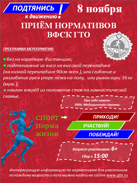 8 ноября запланировано проведение мероприятия по сдаче нормативов ГТО. Участниками станут работники комплексного центра социального обслуживания населения. Приглашаем всех желающих в возрасте 6 лет и старше. При себе иметь обязательно: -УИН; -медицинский допуск. Начало в 15:00, стадион пгт. Юрино и площадка ГТО.