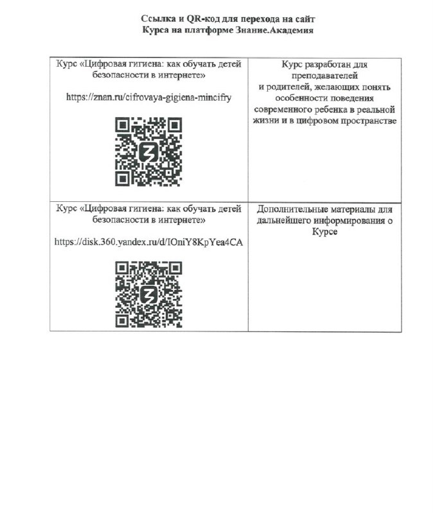 Министерство образования и науки Республики Марий Эл в соответствии с письмом от 18 декабря 2025 г. № П25-125430 Минцифры России сообщает следующее. Общероссийской общественно-государственной просветительской организацией «Российское общество «Знание» разработан бесплатный просветительский онлайн-курс «Цифровая гигиена: как обучать детей безопасности в Интернете» (далее - Курс). Авторы Курса делятся практическими советами: как учителям выстроить коммуникацию с детьми, как проводить тематические уроки по кибербезопасности и как реагировать в случае возникновения онлайн-угроз. Содержание программы Курса направлено на всестороннее рассмотрение проблемы цифровых угроз: от выявления до алгоритма действий при их обнаружении. В программе Курса также предусмотрены рекомендации психологов и советы для педагогов о проведении бесед с учениками и родителями о цифровой гигиене. Курс имеет модульную структуру и включает видеолекции, конспекты и дополнительные учебные материалы по тематике урока. По итогам успешного освоения программы слушателям выдается сертификат. В связи с этим Министерство полагает целесообразным рекомендовать Курс к прохождению педагогическим работникам общеобразовательных учреждений. Также направляем ссылки и QR-коды для перехода на сайт Курса.