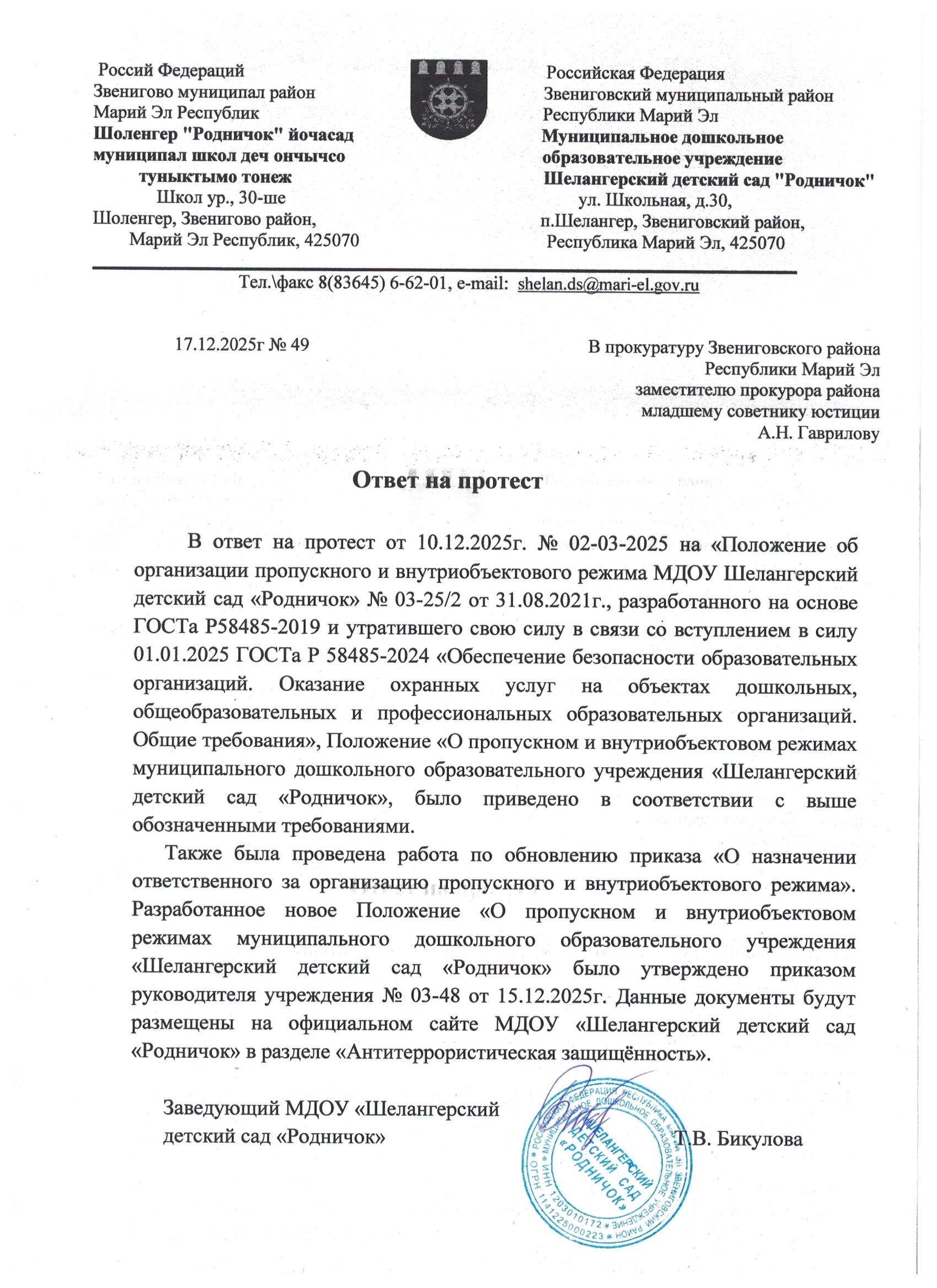 Ответ в на протест прокуратуры от 10.12.2025гДля открытия меню воспользуйтесь сочетанием клавиш SHIFT+ВВОД (в новом окне).