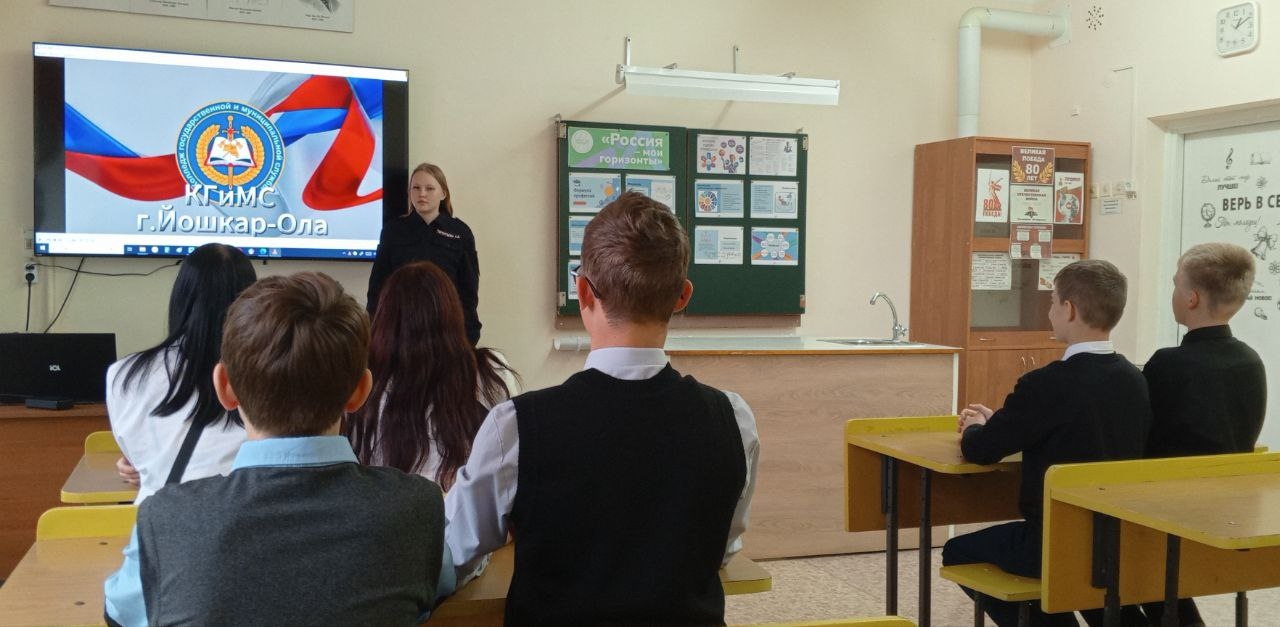 Настя рассказала школьникам о программах обучения («Защита в чрезвычайных ситуациях», «Правоохранительная деятельность», «Пожарная безопасность»), представила видео-презентацию о колледже. Колледж государственной и муниципальной службы ведёт подготовку специалистов в области правоохранительной деятельности, управления системами по предупреждению и ликвидации чрезвычайных ситуаций среднего звена, то есть специалистов, которые могут работать в единой пожарно-спасательной службе, а так же специалистов по пожарной безопасности.