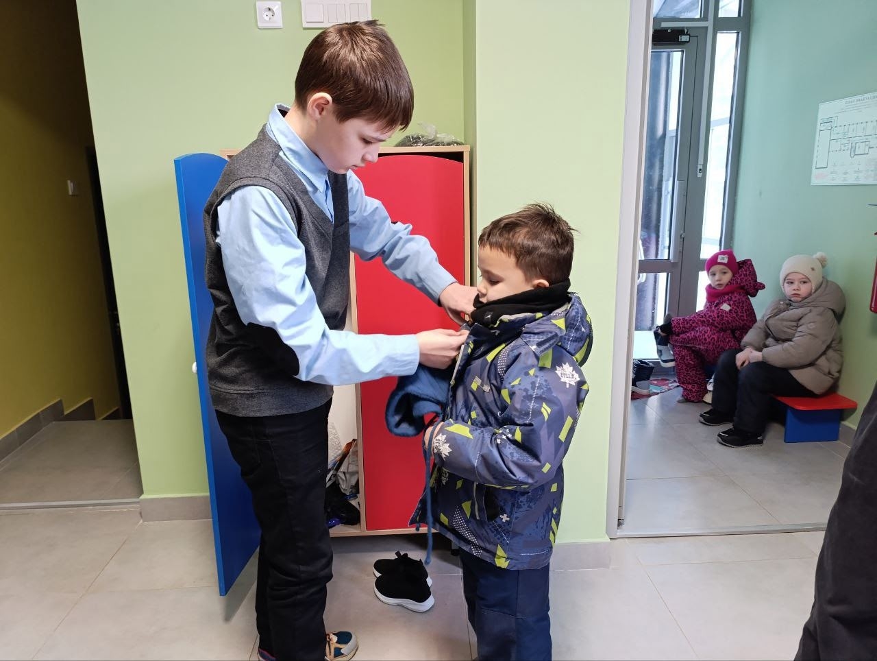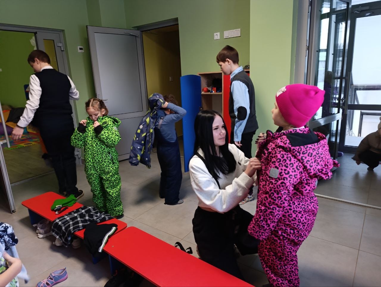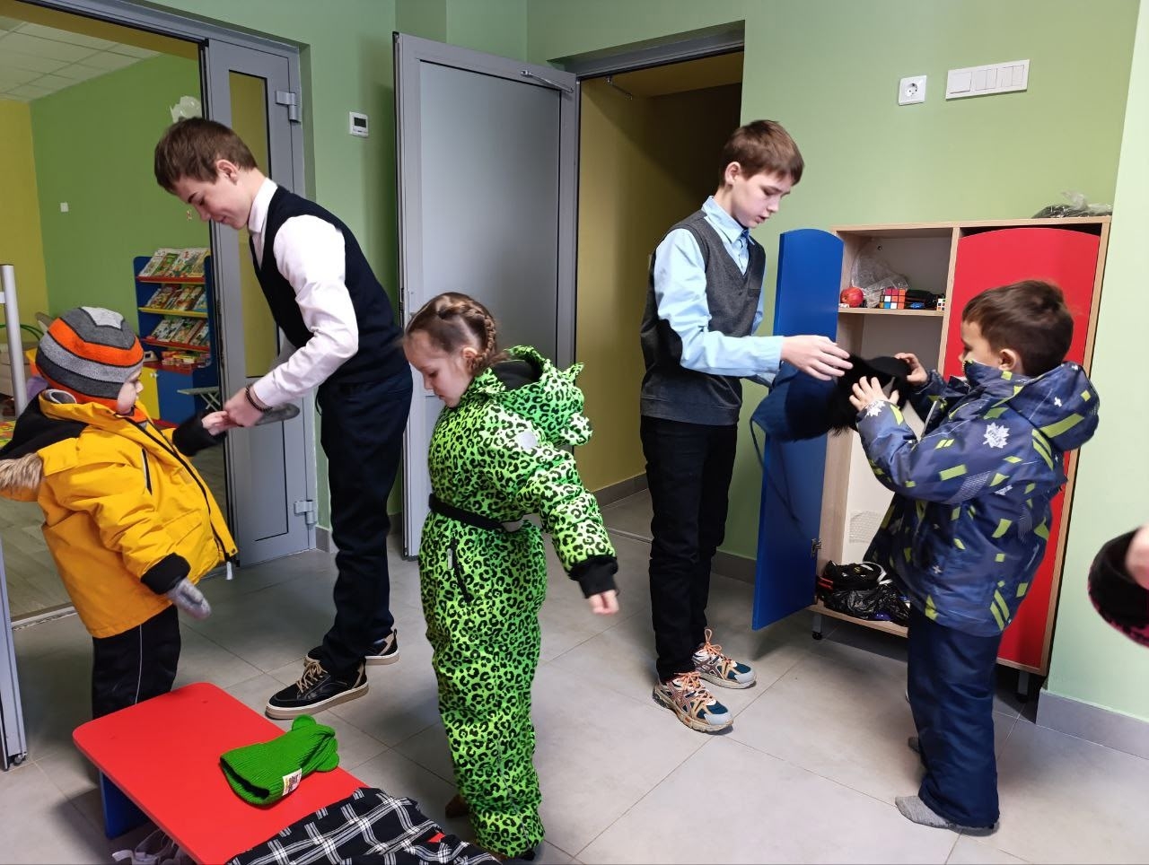 Ребята терпеливо застёгивали пуговицы, завязывали шнурки и надевали шапочки, создавая атмосферу тепла и поддержки. Малыши были рады вниманию и помощи, а сами школьники почувствовали себя настоящими наставниками и друзьями.