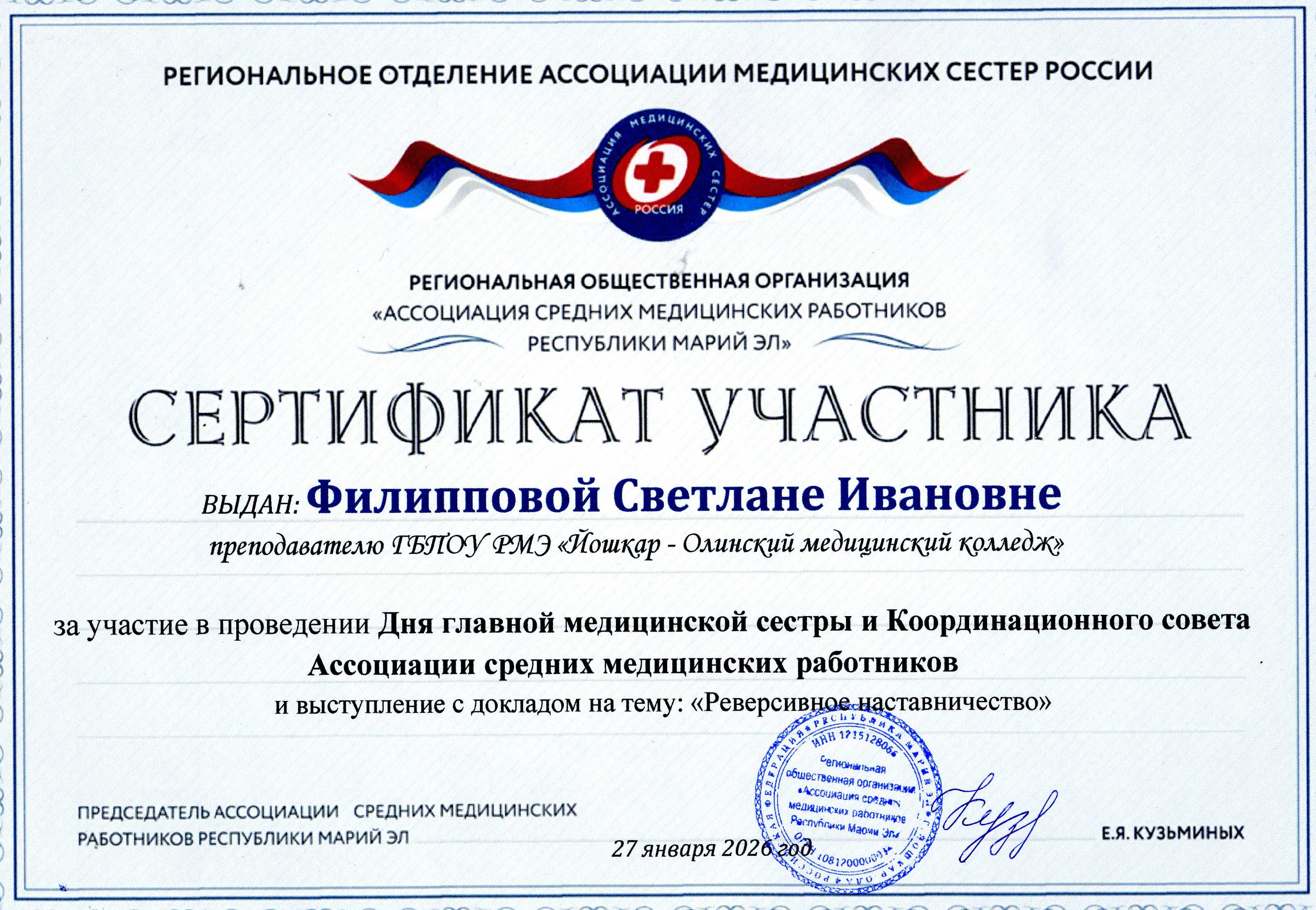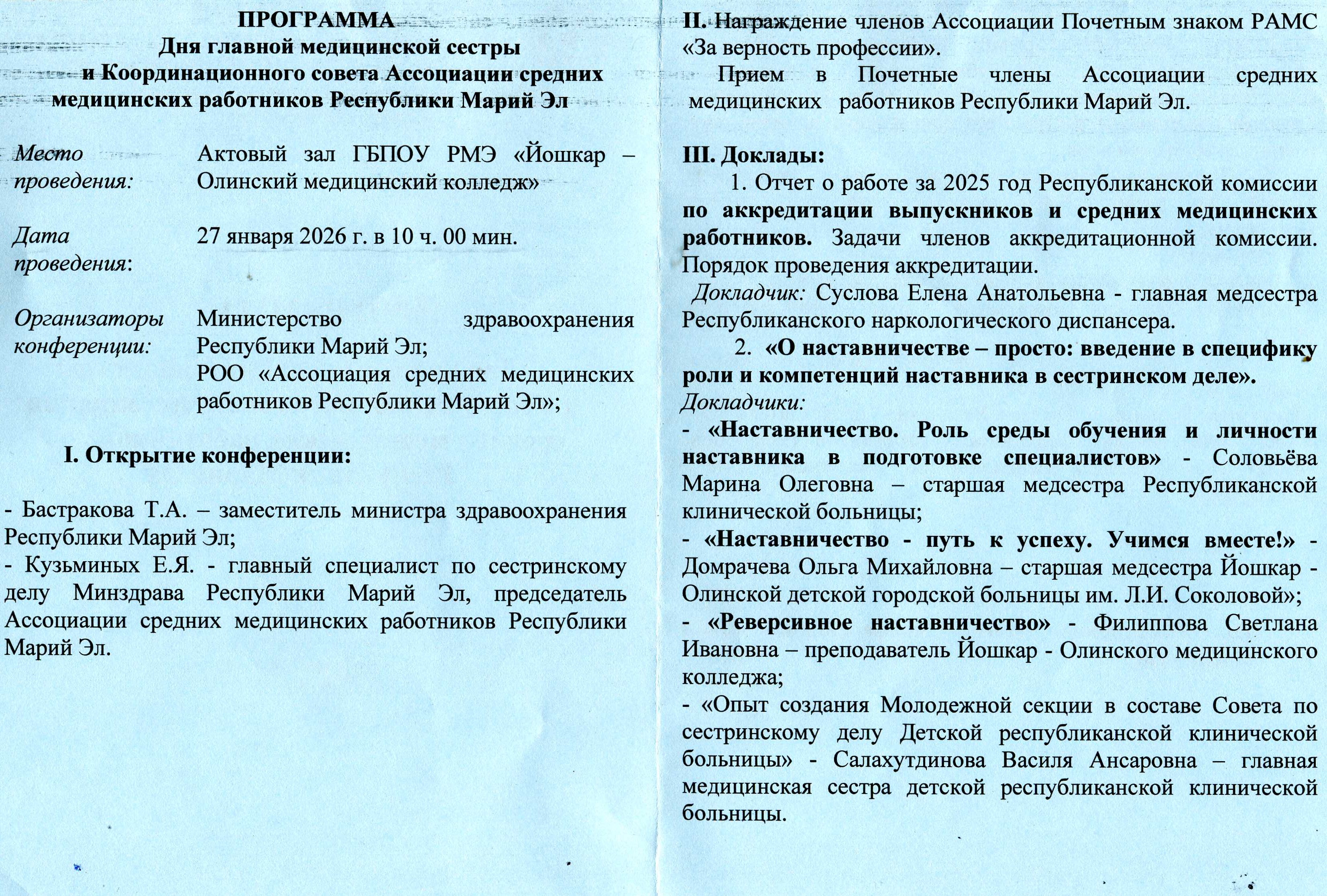 27 января в актовом зале медицинского колледжа состоялся День главной медицинской сестры. Его организатором выступили Минздрав совместно с республиканской ассоциацией средних медицинских работников. В этом ежемесячном совещании приняли участие главные и старшие медицинские сестры медицинских организаций РМЭ. В центре обсуждения стал вопрос о роли наставничества в подготовке специалистов.