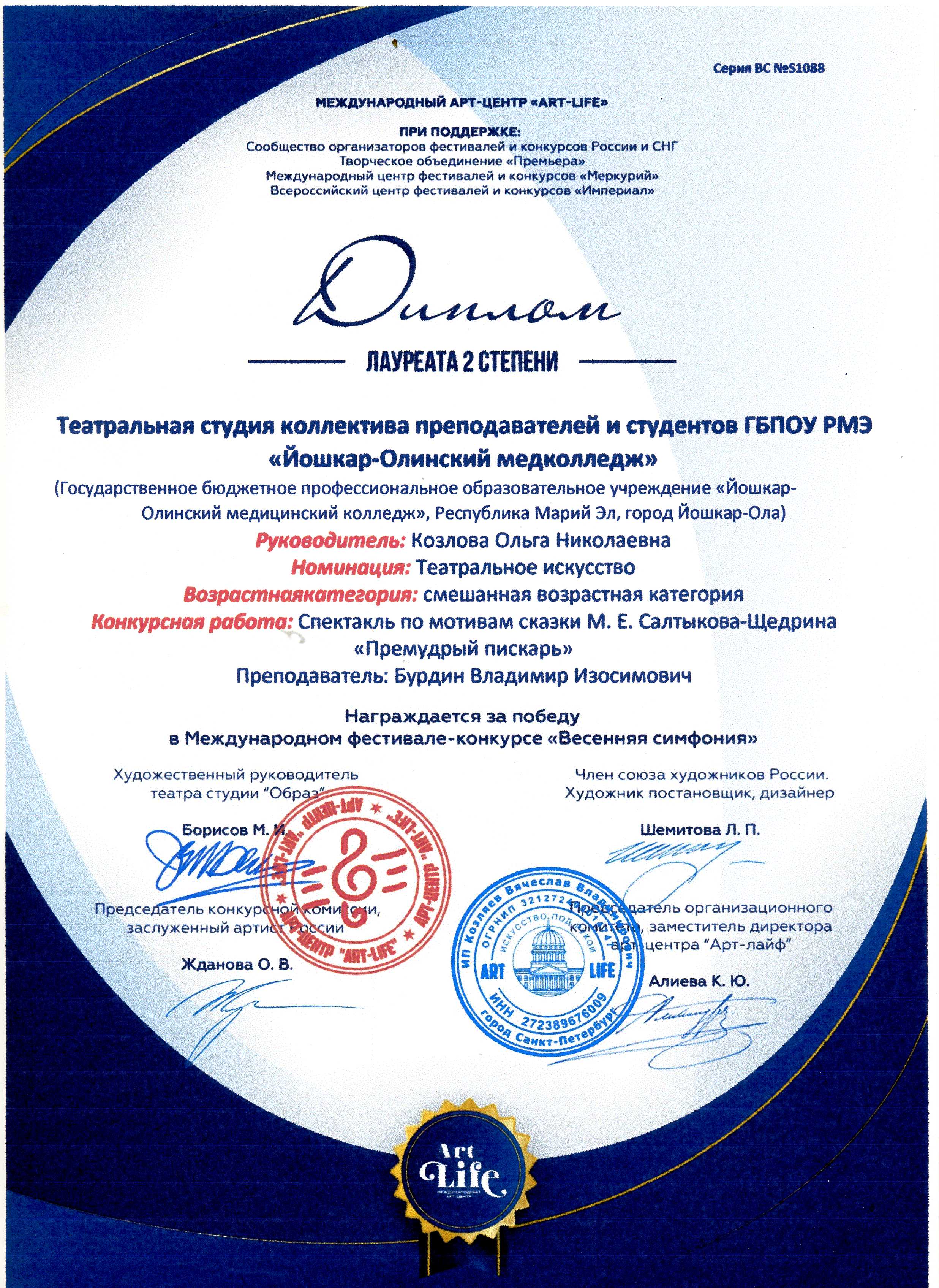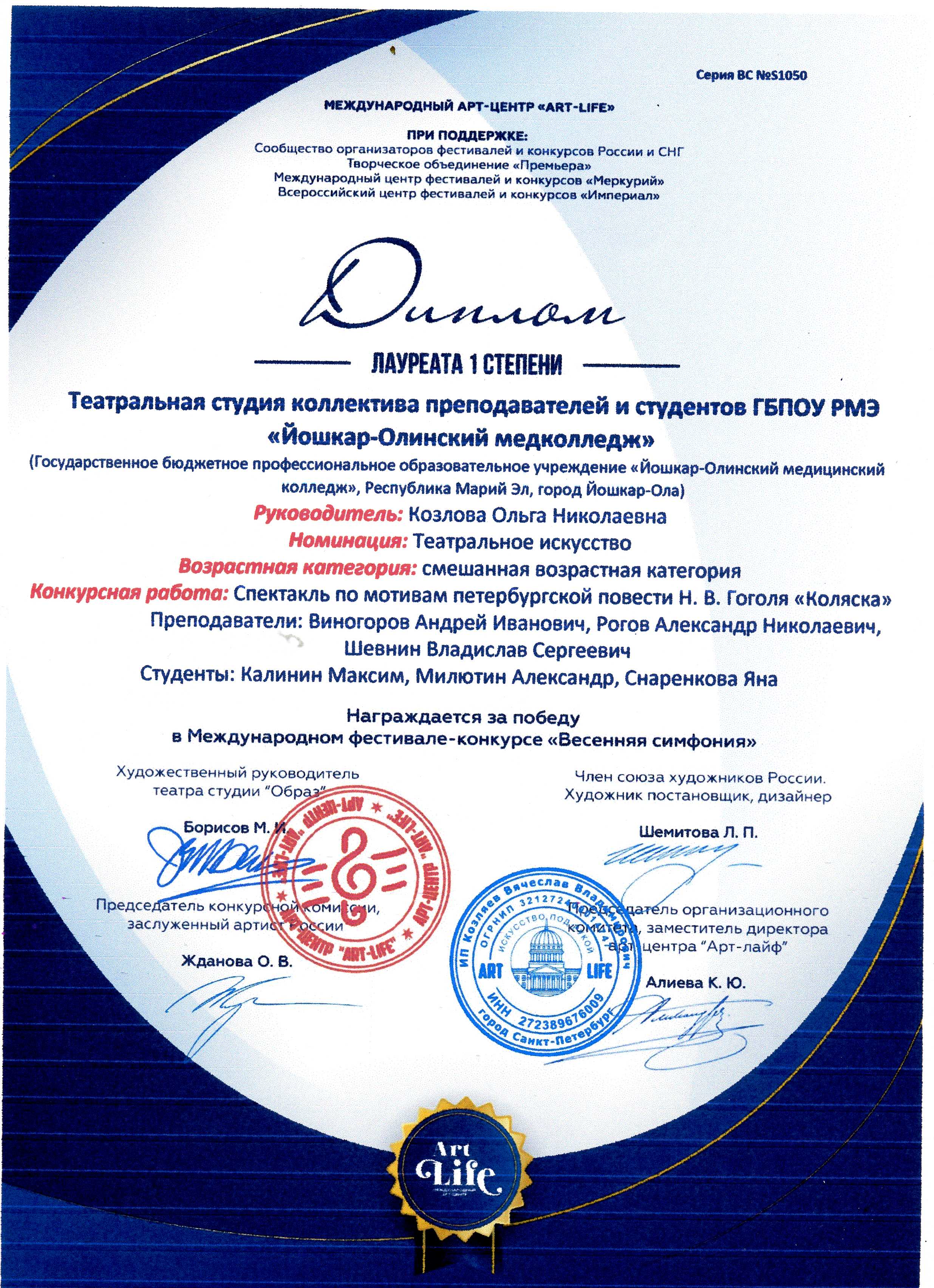 Театральная студия коллектива преподавателей и студентов ГБПОУ РМЭ «ЙМК» представила на международ ный фестиваль- конкурс «Весенняя симфония», прошедший в Санкт-Петербурге в марте 2026 г., спектакли по мотивам повести Н.В. Гоголя «Коляска »и сказки М.Е. Салтыкова –Щедрина « Премудрый пескарь»( к 200-летию со дня рождения писателя), завоевав дипломы Лауреатов первой и второй степени.