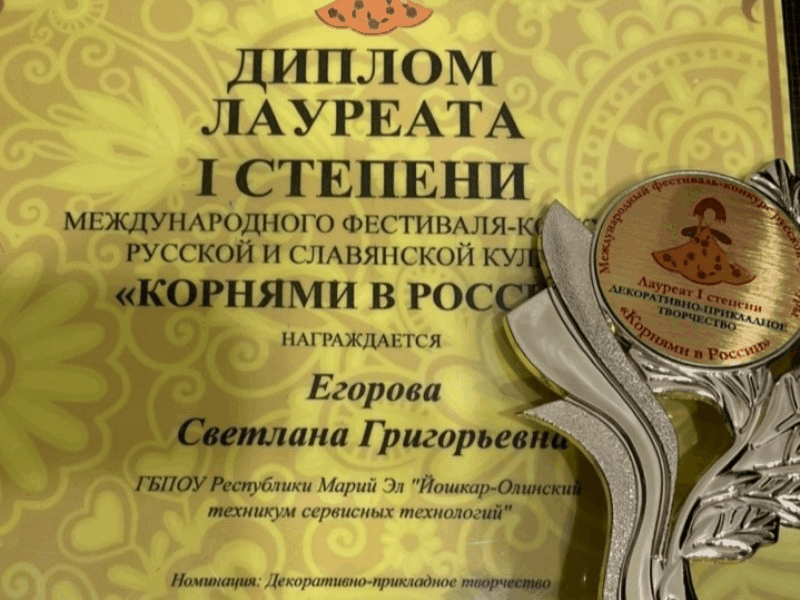 награждена дипломом Лауреата I степени в номинаци "Декоративно-прикладное искусство". Работа назвается: "Кокошник"