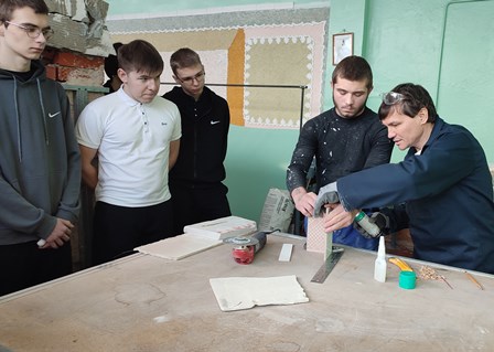 Руслан Рашитович показал ребятам приемы резки плитки болгаркой под прямым углом и под углом 45 градусов для оформления стыков. Рассказал об особенностях выбора инструментов для плиточных работ. Студенты с интересом наблюдали за работой профессионала.